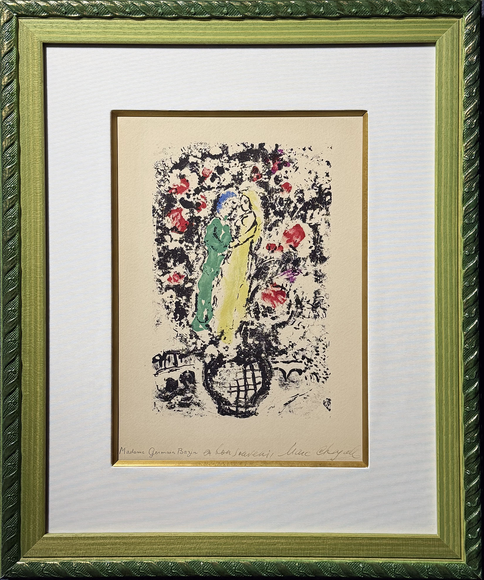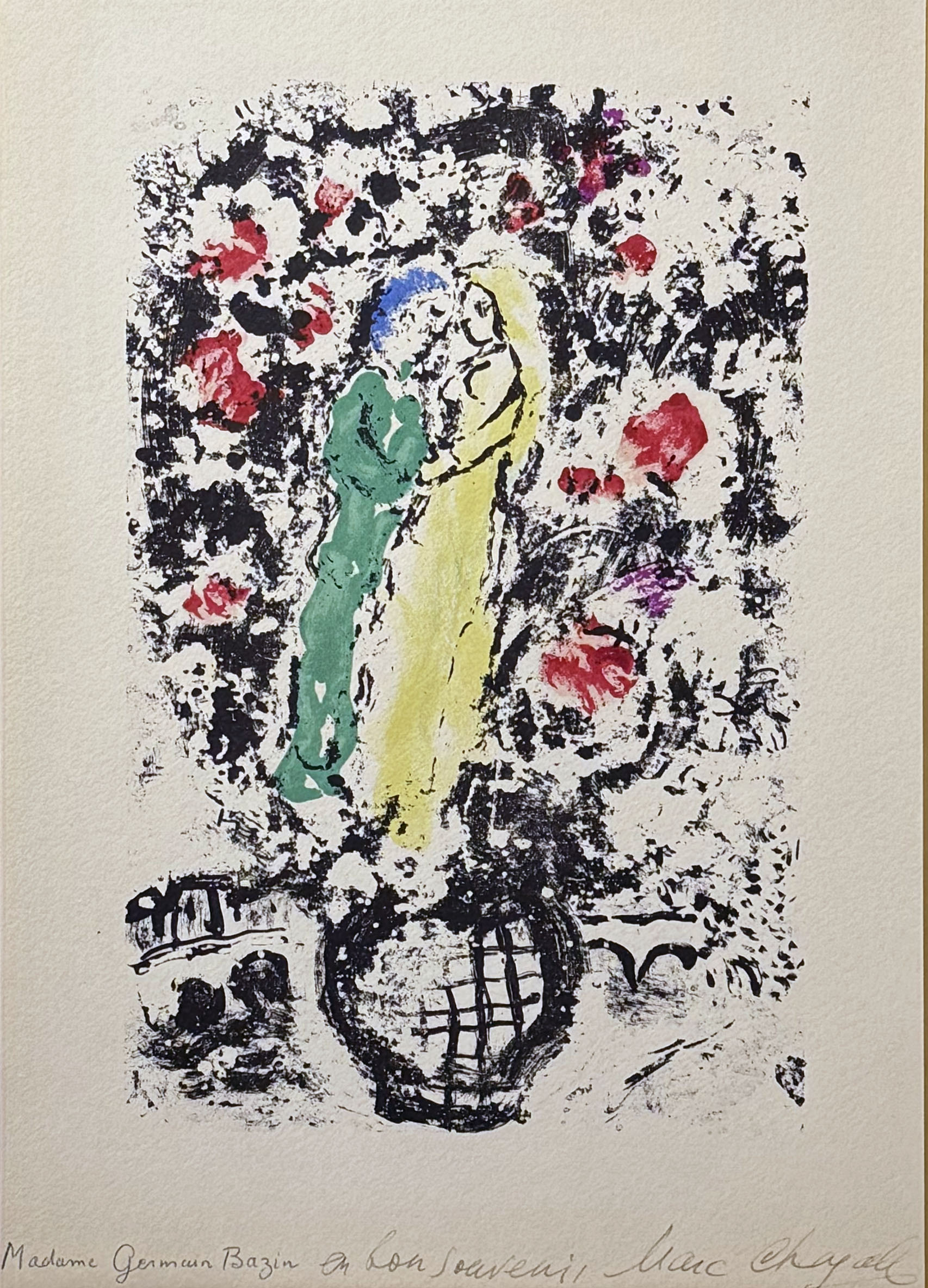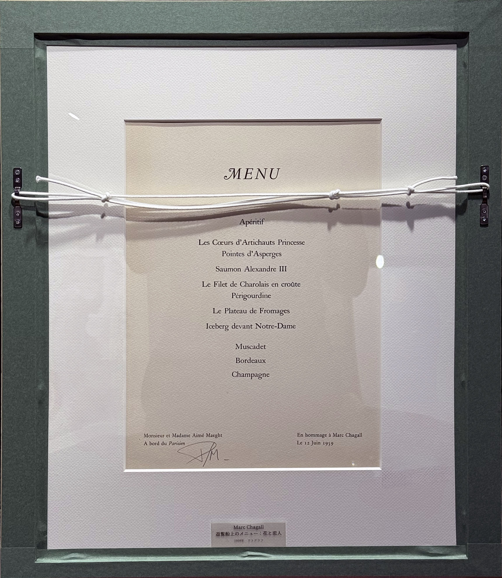 遊覧船上のセレプション用メニューの作品です。裏面にはその日のメニューが書かれており、あわせてお楽しみいただけるようにリバーシブルに額装しました。右下にはシャガールのペンサインが入っている、遊び心あふれる作品です。