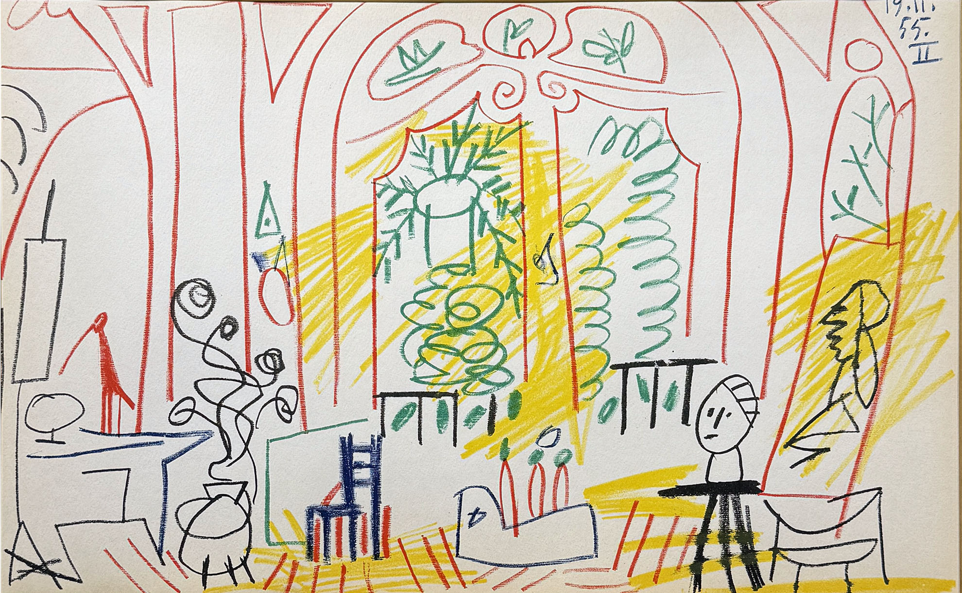 「カリフォルニーの手帖」は、ピカソが1955年11月1日から1956年1月14日の間にスケッチブックに描いた素描をもとに制作されたリトグラフ集のうちの1枚です。